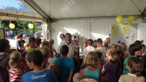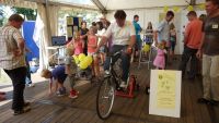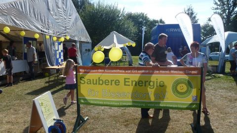 Gezeigt wurde unter anderem ein Elektroauto, für das sich viele interessierten. Am Tisch vom Museum am Schölerberg konnten große und kleine Kinder mit Wind- und Sonnenenergie experimentieren. Herr Halfter stellte fest, dass man am Stand des Vereins auch etwas bewegen kann. Mit Hilfe eines Fahrrades und etwas Muskelkraft hat Herr Halfter einen 230V Ventilator angetrieben. Für die Kids bis 13 Jahre gab es ein Energiequiz, an dem sich 110 Kinder beteiligten. In diesem Quiz ging es rund um das Thema regenerative Energien und Energiesparen.